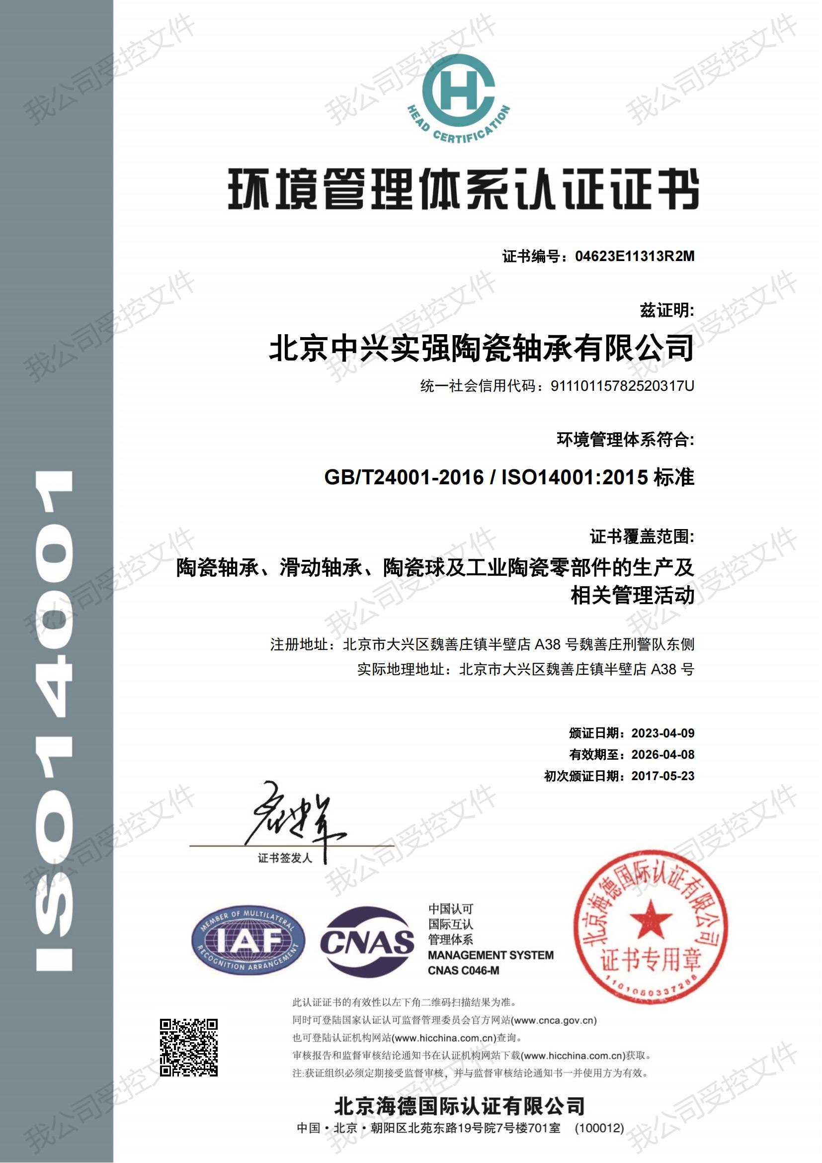 環境管理體系認證證書